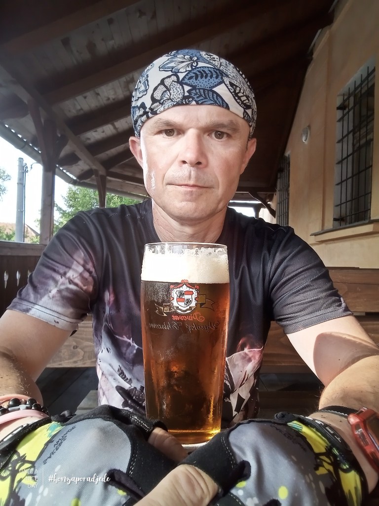 Pak už jsem nějaký plán ala mapy.cz zavrhl a dál se vést asfaltem a na cestu se raději pro jistotu doptal živých bytostí. Tak jsem se dopracoval po 21km v 33°C přes Oříkov kolem skanzenu ve V. Chlumci, kdy už jsem kolo raději tlačil do Staré hospody. Poněkud zbědovaný, ale spokojený, že dnešní útrapy jsou už za mnou. Dva hrníčky Prince 🍺 za 26CZK to spravily a já se zase vrátil zpět do použitelného stavu.