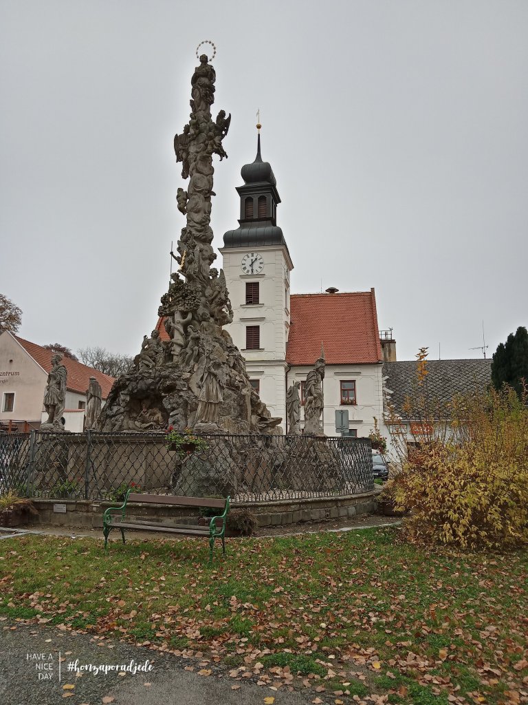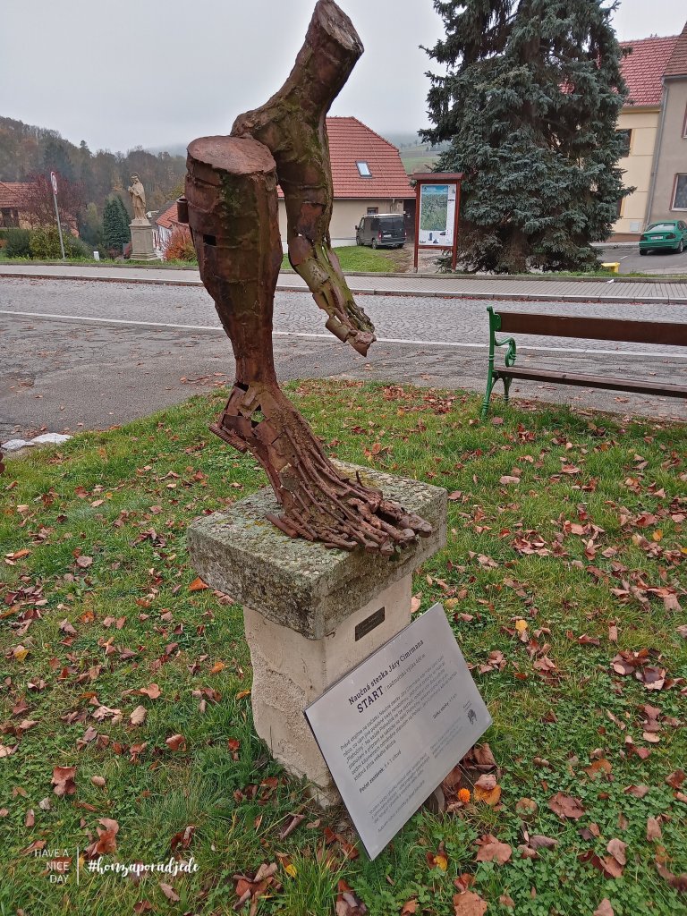 Tady je moc pěkný morový sloup (též Mariánský sloup) z roku 1710 a kostel Navštívení Panny Marie. Rozhodně doporučuji nakouknout dovnitř. Na náměstí též začíná 4,5km naučná stezka Járy Cimrmana jejíž jednotlivé části se nazývají „Plahočiny”. Hlavním cílem je tedy člověka zhuntovat. Začíná na náměstí u desky s „rezavými botami”. Tak jsem konečně prozkoumal Lomnici a přes Lomničku do Tišnova na vlak. V Lomničce u silnice se nachází socha Sokola, která je zde na paměť Sokolského sdružení. Po hodně, řekněme vlhkých 43km jsem dorazil do Tišnova.