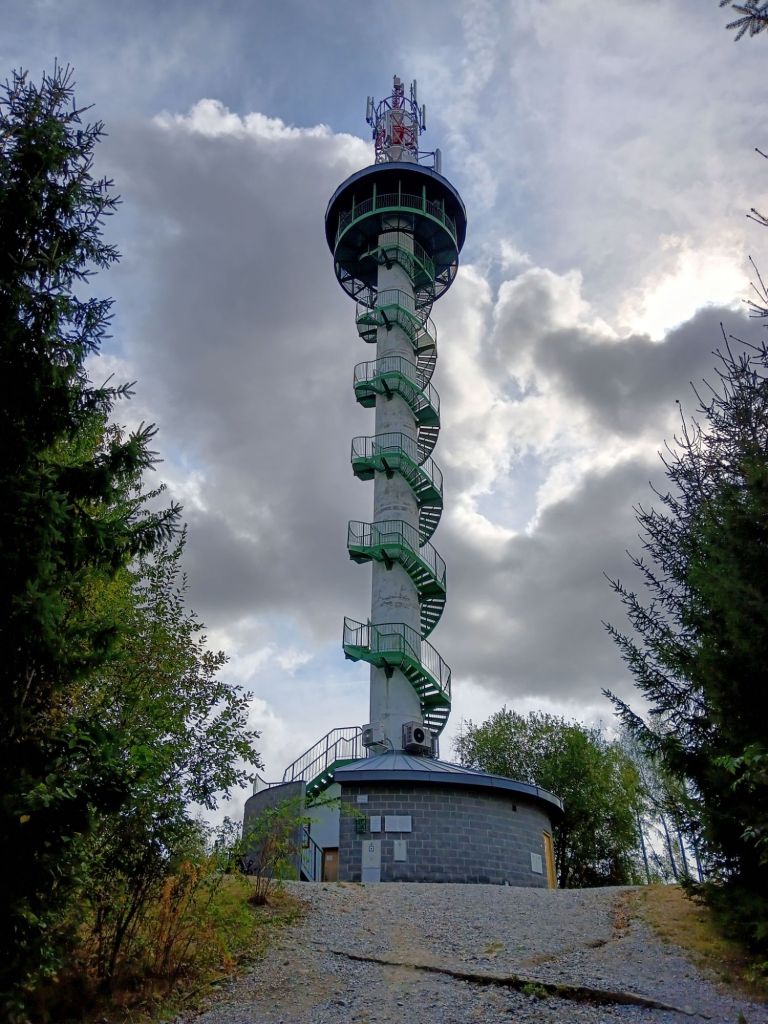 Výstup z vlaku jsem měl v Blansku a hned mě to hnalo do zatraceného kopce směr Češkovice – Obůrka – Veselice. Na této trase se nachází 590mnm rozhledna Podvrší měřící 49m, ochoz je v nadmořské výšce 621mnm a až nahoru to je rovných 168 schodů. Tahle celokovová rozhledna není nic pro slabé povahy, pořád vidíte průhledem přes točící se schody dolů a hodně to tu fouká. Naštěstí s tím problém nemám. Rozhled odsud je při jasném počasí fascinující a to dá se říct bylo i když se chvílemi honily mraky. Vstup je zpoplatněný 30 korunami, ale za to dostanete jako bonus hezkou vstupenku se všemi daty vztahujícími se k rozhledně.