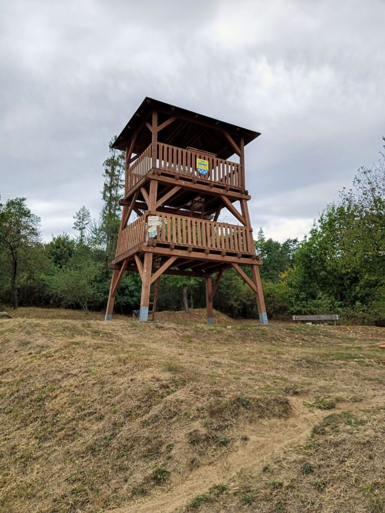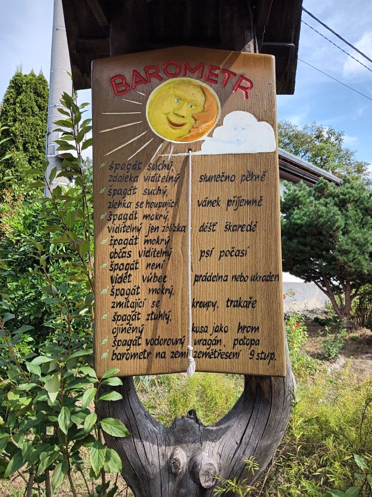 Většinou mě táhly mapy.cz tou nejmíň pohodlnou trasou, „pouští a pralesem”. Tak jsem občas neměl ani tucha kde jsem. Z Veselice do Petrovic to ale už celkem šlo, pak mě to zahnalo do Karolína, kde jsem u jedné pěkné dřevěnice našel pěkný rukodělný barometr počasí. Pak jsem proplétal ulicemi Rájce-Jestřebí a Rájcem, bloudil jsem, avšak proti cestě na Spešovskou rozhlednu to byla úplná sranda. Tady jsem byl doslova v prdeli. Není radno 100% věřit ani ověřeným seznam mapám, zahnaly mě doslova do kouta, cestičkou, která se neustále zužovala až úplně zmizela. Musel jsem to vzít do vlastních rukou a vrátit se a řešení jsem našel. Prostě jsem přehlédl odbočku k rozhledně, na svou obhajobu uvedu nulové značení. Tak jsem po všech útrapách dorazil k pěkné dřevěné rozhledně o výšce 9,9m na kterou nevedou žádné schody, ale dva žebříky. Kolik měly celkem šprušlí jsem ani nepočítal, že by 20? Z jedné strany les a z druhé byla krásně vidět navštívená rozhledna Podvrší. Pak už zase hurá dál. Bořítov – Černá Hora – les a výjezd v Žernovníku, úplně zbytečně, protože po 377 je to co by kamenem dohodil.
