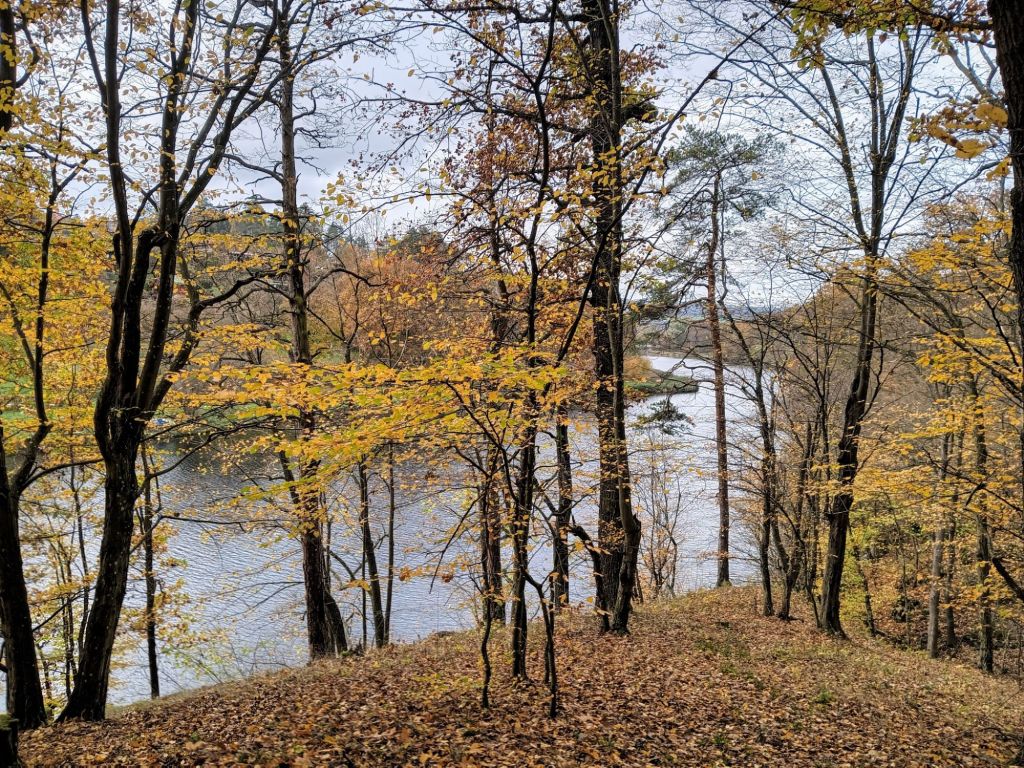 Potom jsem se vrátil malý kousek nazpět a přes most jel po hřebenu někdy se spíš šprtal nebo šel úzkou cestičkou s prudkým srázem nad přehradou. Cestička pokrytá listím, navlhlé kořeny a kameny, takže je lepší neriskovat, každý špatný „krok” by totiž byl nevratný. Výhledy odsud jsou však parádní. Touto cestou jsem minul Veverskou Bítýšku a z lesa vyjel až před Chudčicemi. Ani tady jsem ale nevyjel na silnicí a dál pokračoval stezkou až do Moravských Knínic a odsud po asfaltové cyklostezce až do Kuřimi. To už se začínalo pomalu šeřit.