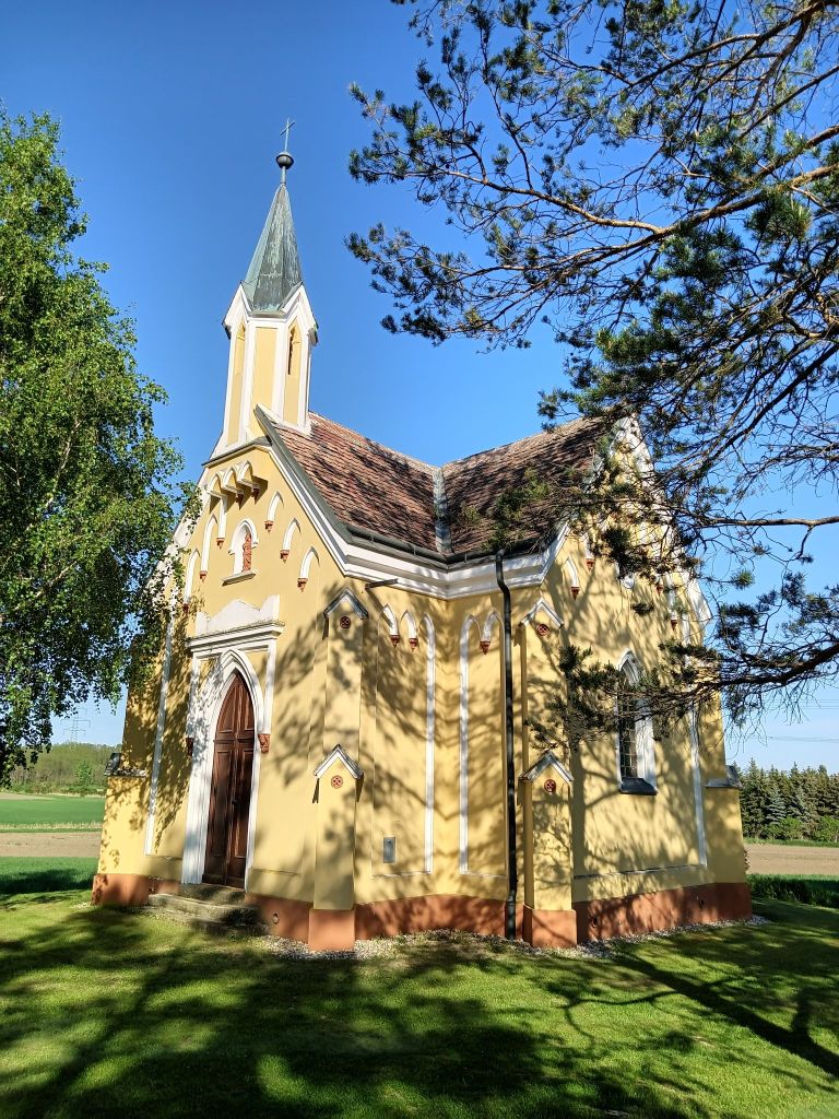 Cestou jsem občas fotil, ale déle jsem se vlastně zdržel jen na okraji Pernersdorfu kde mě zaujala kaple Sv. Magdalény a pak chvilkový únik před rozžhaveným ☀️. To už jsem směřoval k Jetzelsdorfu a Retzu. Tady jsem se moc nezdržoval protože okolí mám projeté křížem krážem a pokračoval ke státní hranici. Žízeň jsem už měl jak sviňa, tak jsem si dal hned za hranicemi u benzínky jedno plechvkové 🍺, druhé do tašky na kole a dojel do campu Havraníky na ubytování. Chatku jsem měl sám pro sebe tak to bylo prima, pak ještě jedna rodinná návštěva (Upřímně, měl jsem se na ní vysrat!). Dal si u hospody dva Hostany a ve 20:30hod. jsem zalehl. Resumé 2.5. bylo 111,32km.